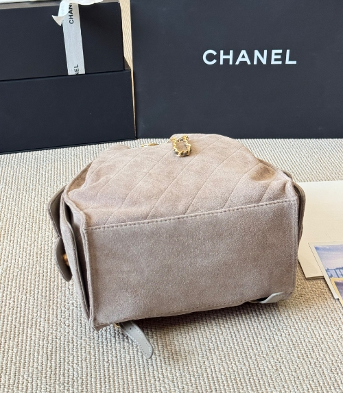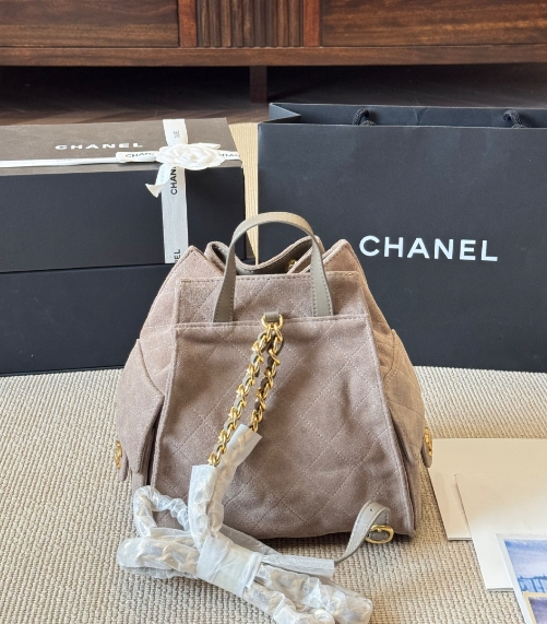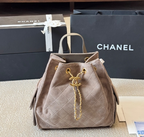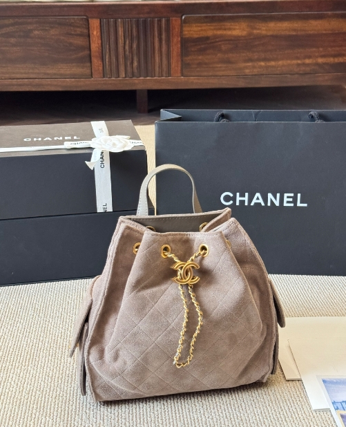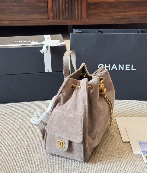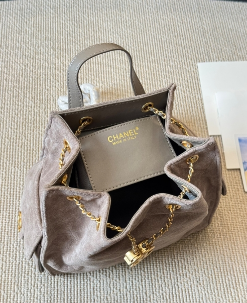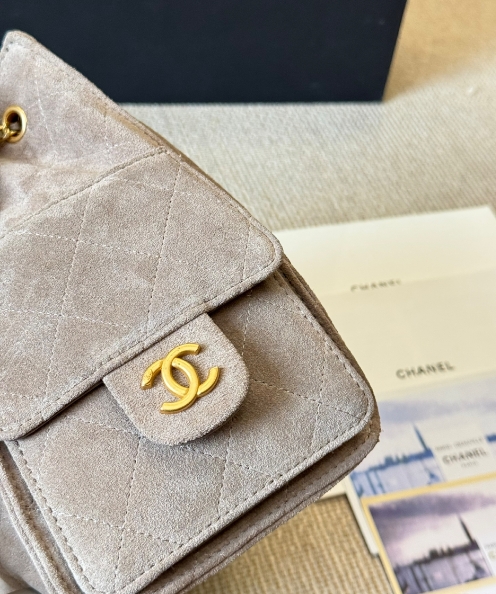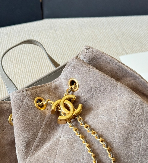 Chanel fashion show grey suede hobo playful leather bag double c drawstring chain armpit bag small size
